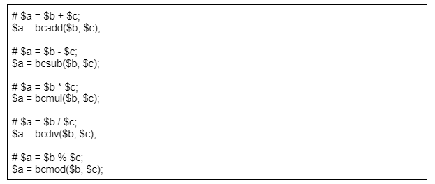 PHPの演算子での計算を行っていたロジックは以下のようにBCMathのbcadd(加算)、bcsub(減算)、bcmul(乗算)、bcdiv(除算)、bcmod(剰余)関数に置き換えるよう改修しなければいけません。